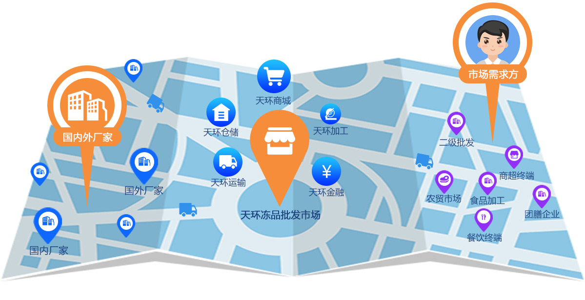 天環供應鏈管理有限公司依托于天環冷鏈業已建成凍品食品批發市場,在傳統的凍品食品批發市場基礎上,利用互聯網、物聯網等信息技術手段,通過對市場中的商流、物流、信息流及資金流等供應鏈要素的流程再造,形成線上線下融合的冷凍品食材交易平臺,覆蓋餐飲終端、商超、食材加工等食材流通渠道的物流配送平臺,以及滿足供應鏈上下游各方便捷融資的資金平臺。